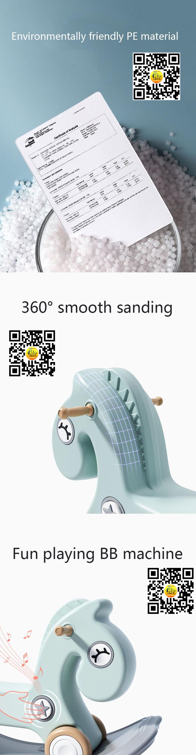 Các sản phẩm ngựa bập bênh được sản xuất từ chất liệu nhựa cao cấp, không chưa PBA hay các chất hóa học gây độc hại khác gây ảnh hưởng đến sức khỏe của các em nhỏ. Chất liệu được sử dụng có khả năng chịu lực cao, bề mặt bệp bênh trơn nhẵn, láng mịn, không có góc cạnh sắc nhọn đảm bảo an toàn tuyệt đối cho các em nhỏ khi vui chơi.
