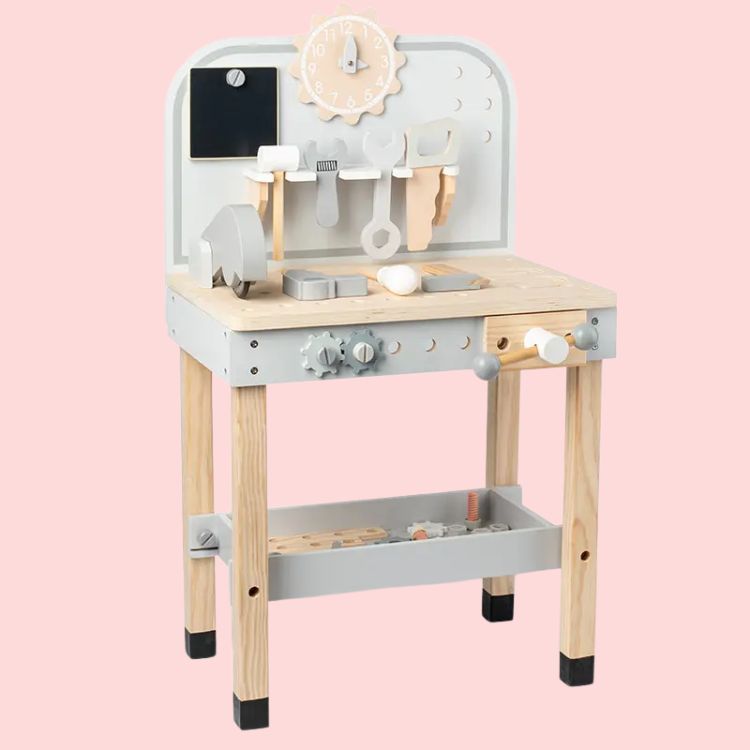 - Bộ sản phẩm bao gồm một bàn kỹ thuật mô phỏng có đồng hồ, bảng viết phấn, kệ treo dụng cụ và hàng loạt chi tiết như búa, cưa, tua vít, đai ốc, bánh răng… Bé có thể lắp ráp, tháo rời, xây dựng mô hình và nhập vai kỹ sư sửa chữa như người lớn, giúp tăng cường kỹ năng tư duy – vận động toàn diện.