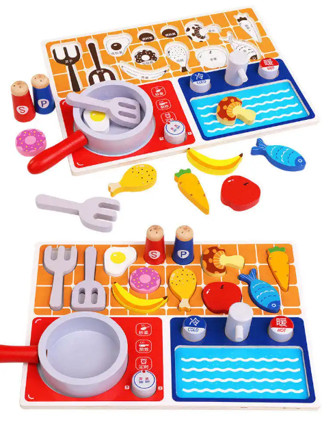 - Thực phẩm mô phỏng: Gồm rau củ, thịt cá, bánh kẹo… với thiết kế giống thật, một số loại có thể tách rời để bé thực hành "cắt" và "chế biến".