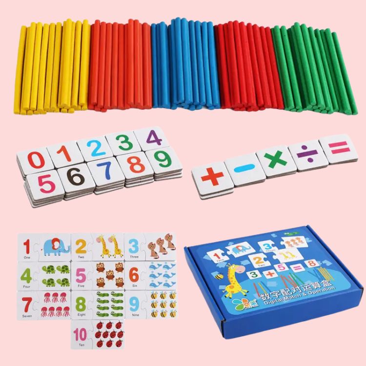 - Thiết kế khoa học: Gồm thẻ số từ 0–9, thẻ phép tính (+, –, ×, ÷, =) và nhiều que tính theo màu sắc riêng biệt (vàng, đỏ, xanh dương, xanh lá), giúp trẻ dễ phân biệt và ghi nhớ.