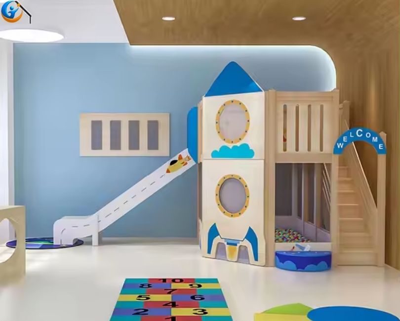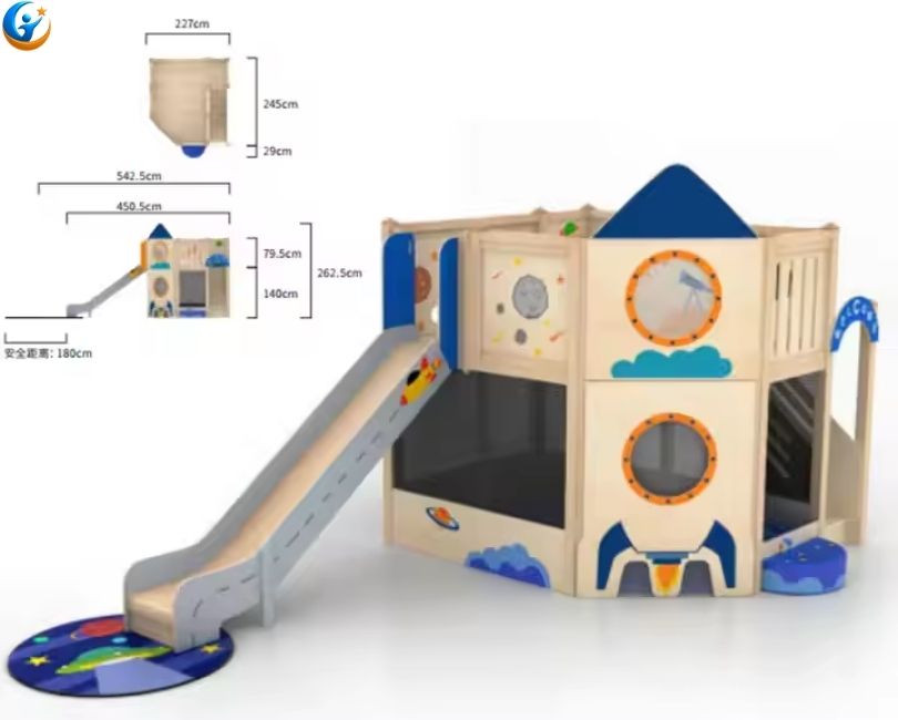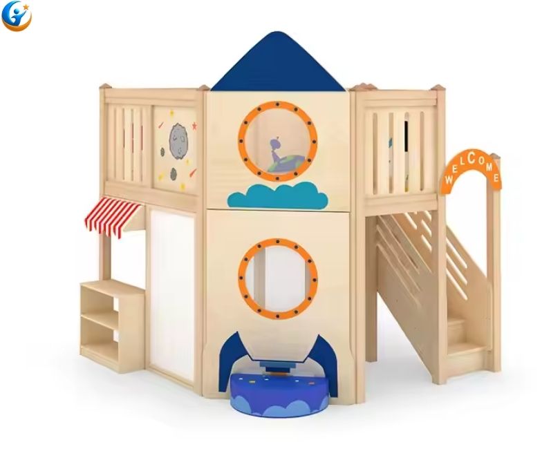 bộ vận động gỗ, đồ chơi mầm non, bộ vận động mầm non, cầu trượt gỗ cho bé, thiết bị mầm non trong nhà, khu vui chơi gỗ cho trẻ, bộ vận động chủ đề tên lửa, thiết bị giáo dục thể chất cho bé