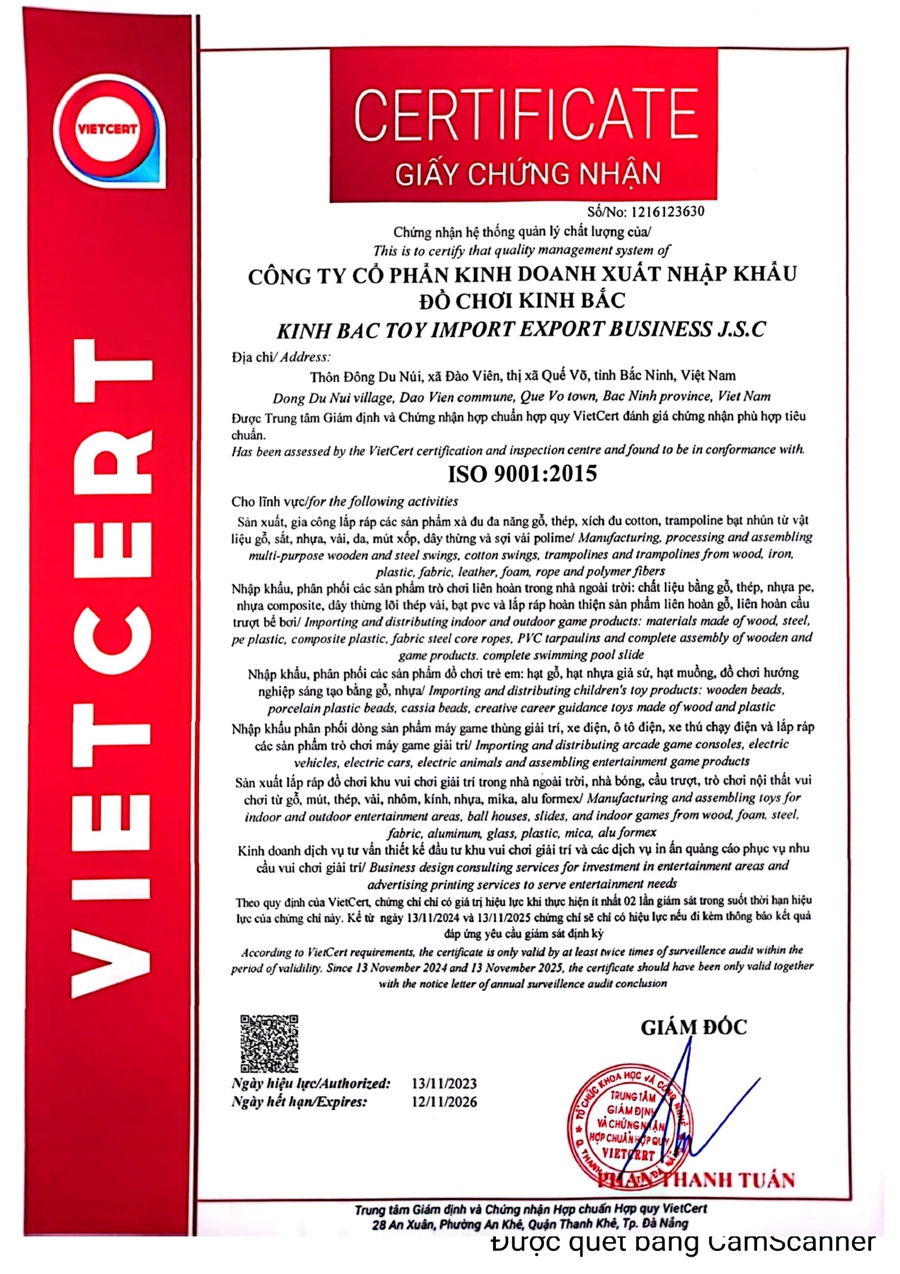 Với chứng nhận ISO 9001:2015, Đồ Chơi Kinh Bắc không chỉ khẳng định chất lượng sản phẩm mà còn cam kết đồng hành cùng khách hàng trên hành trình kiến tạo không gian vui chơi sáng tạo, an toàn và ý nghĩa.