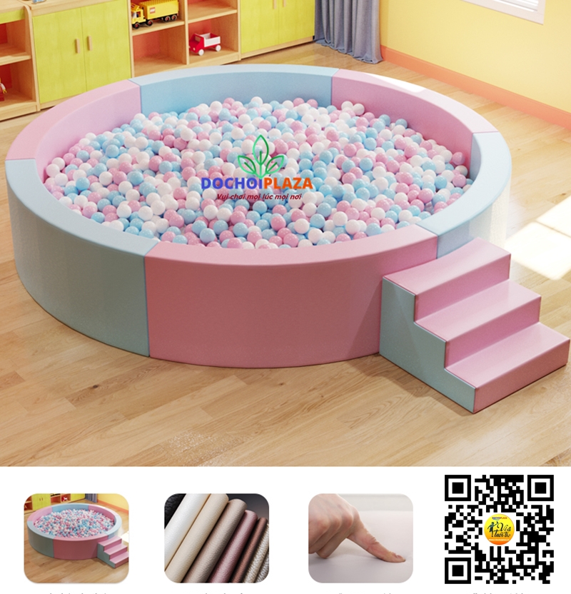 - khung nhà banh bằng gỗ + mút + da pu cao cấp khó bị xô đẩy khi có nhiều bé vui chơi